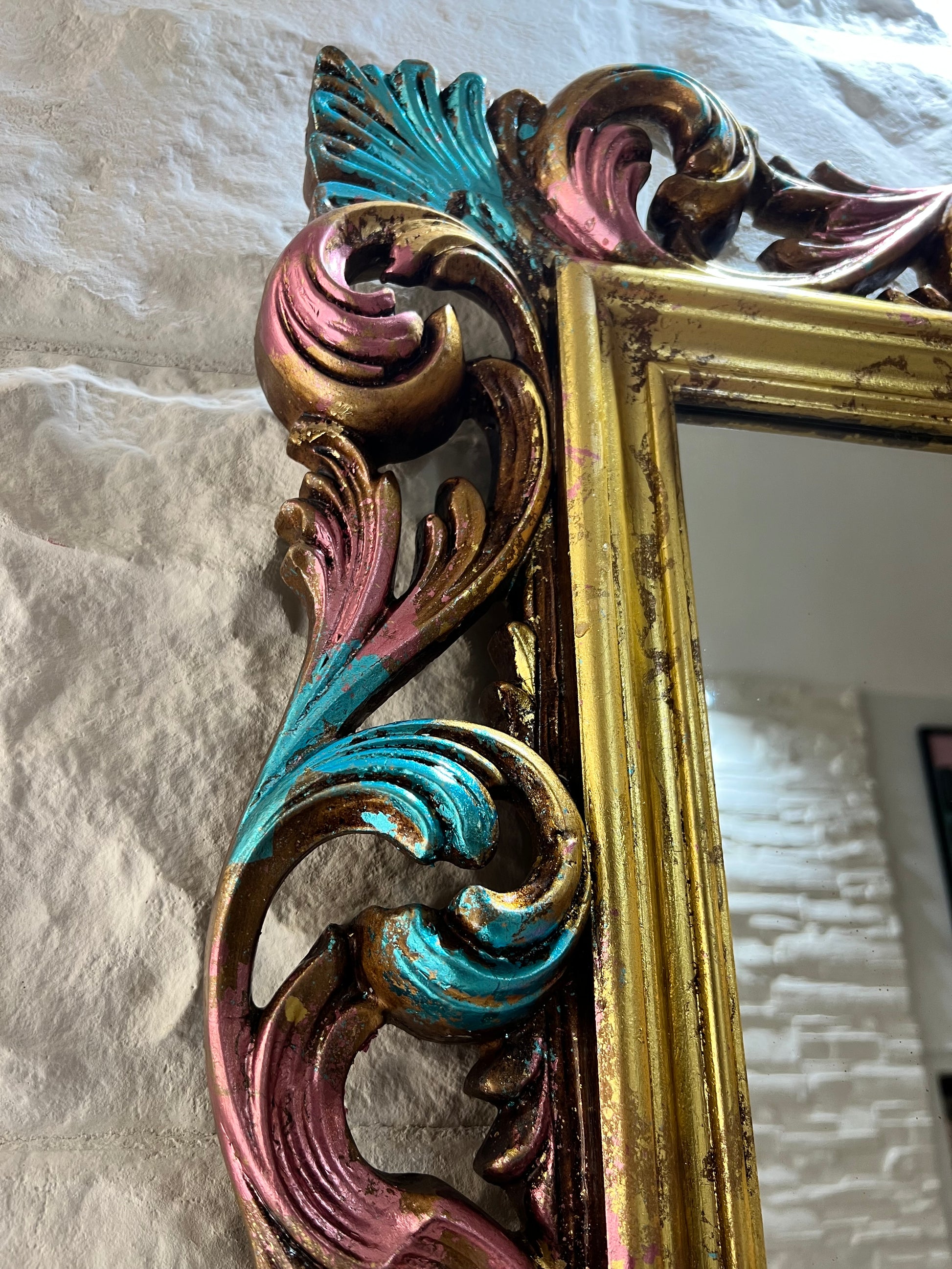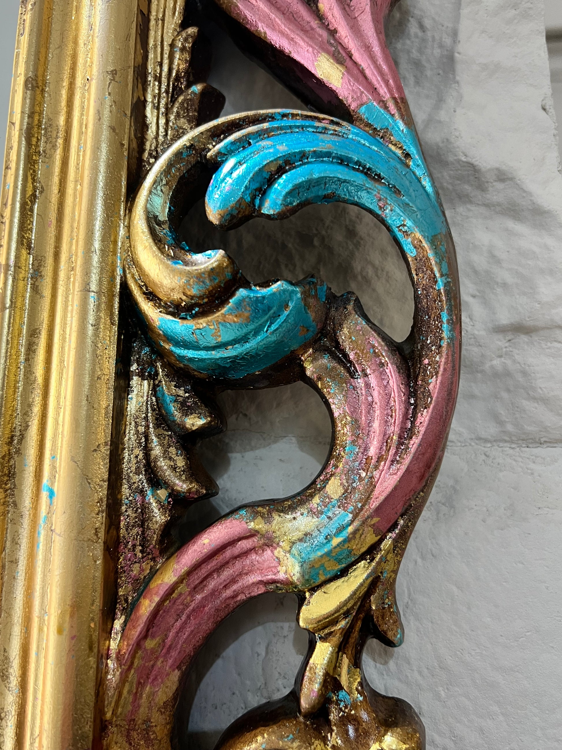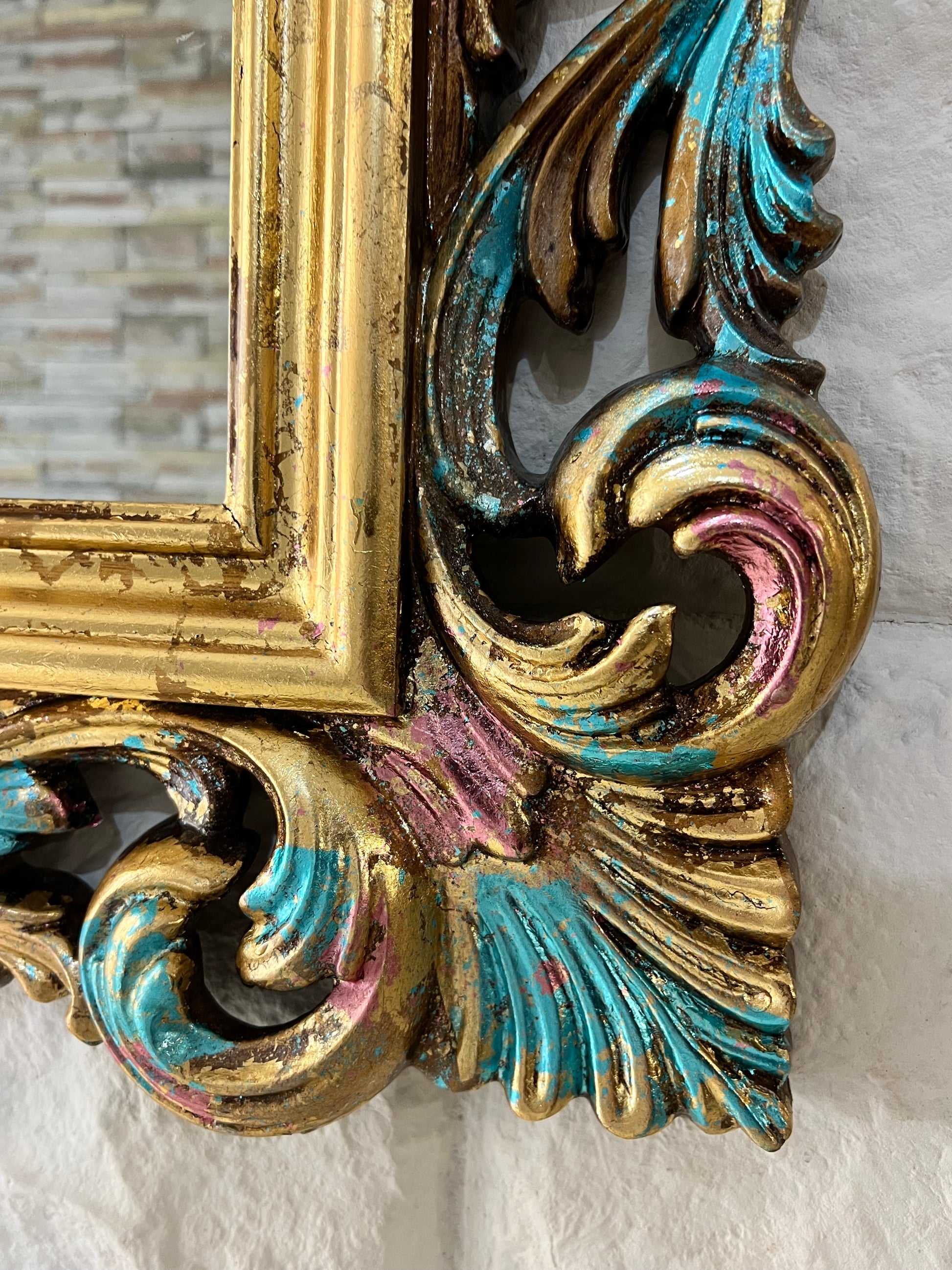 È un autentico specchio di fine ’800, un pezzo di vero antiquariato che ha attraversato il tempo, le persone, le scelte, Oggi rinasce attraverso un intervento artistico contemporaneo: restaurato a mano con foglia oro, foglia rame e foglia turchese, materiali nobili che dialogano con la sua anima antica e ne amplificano il valore.