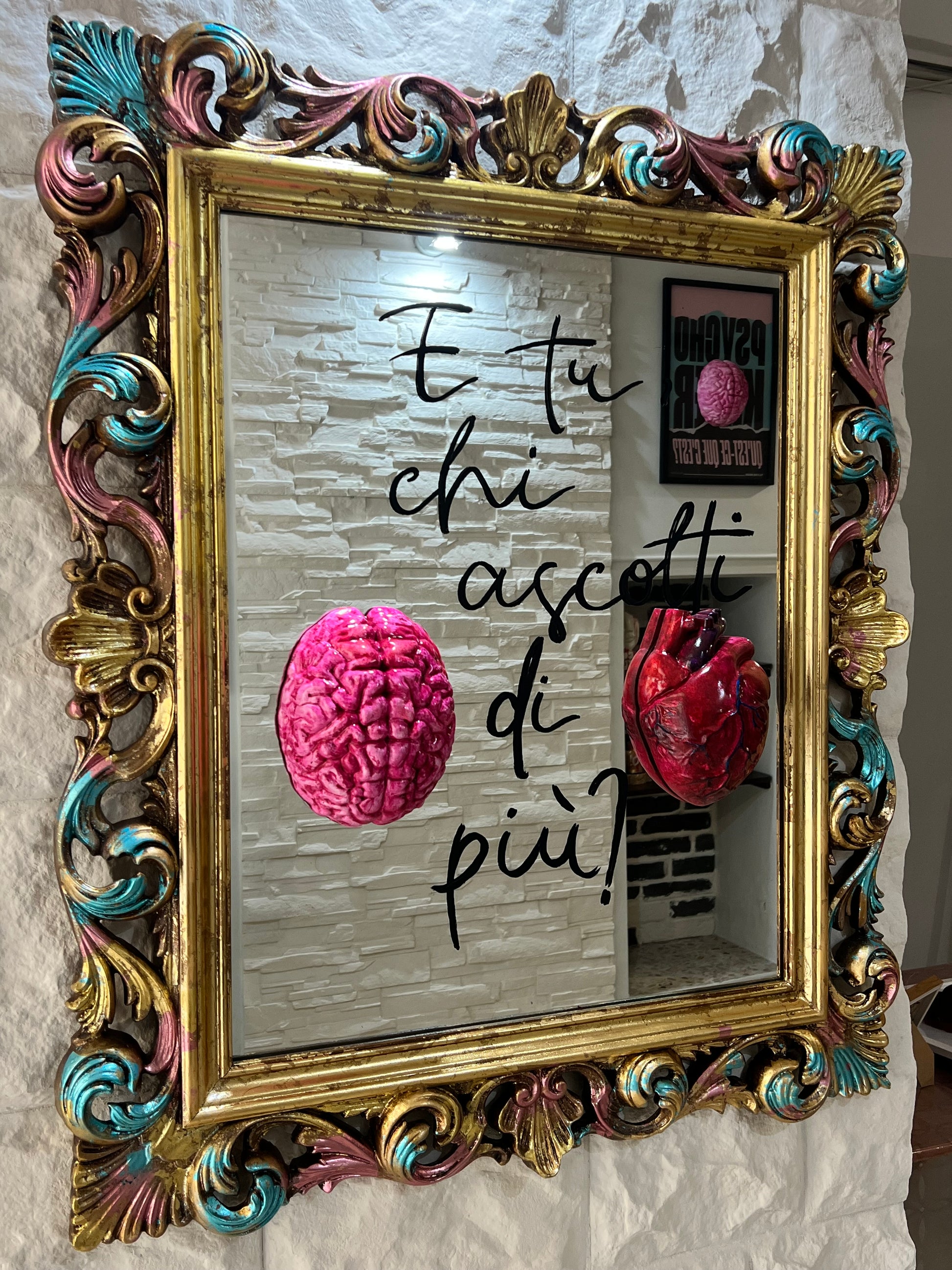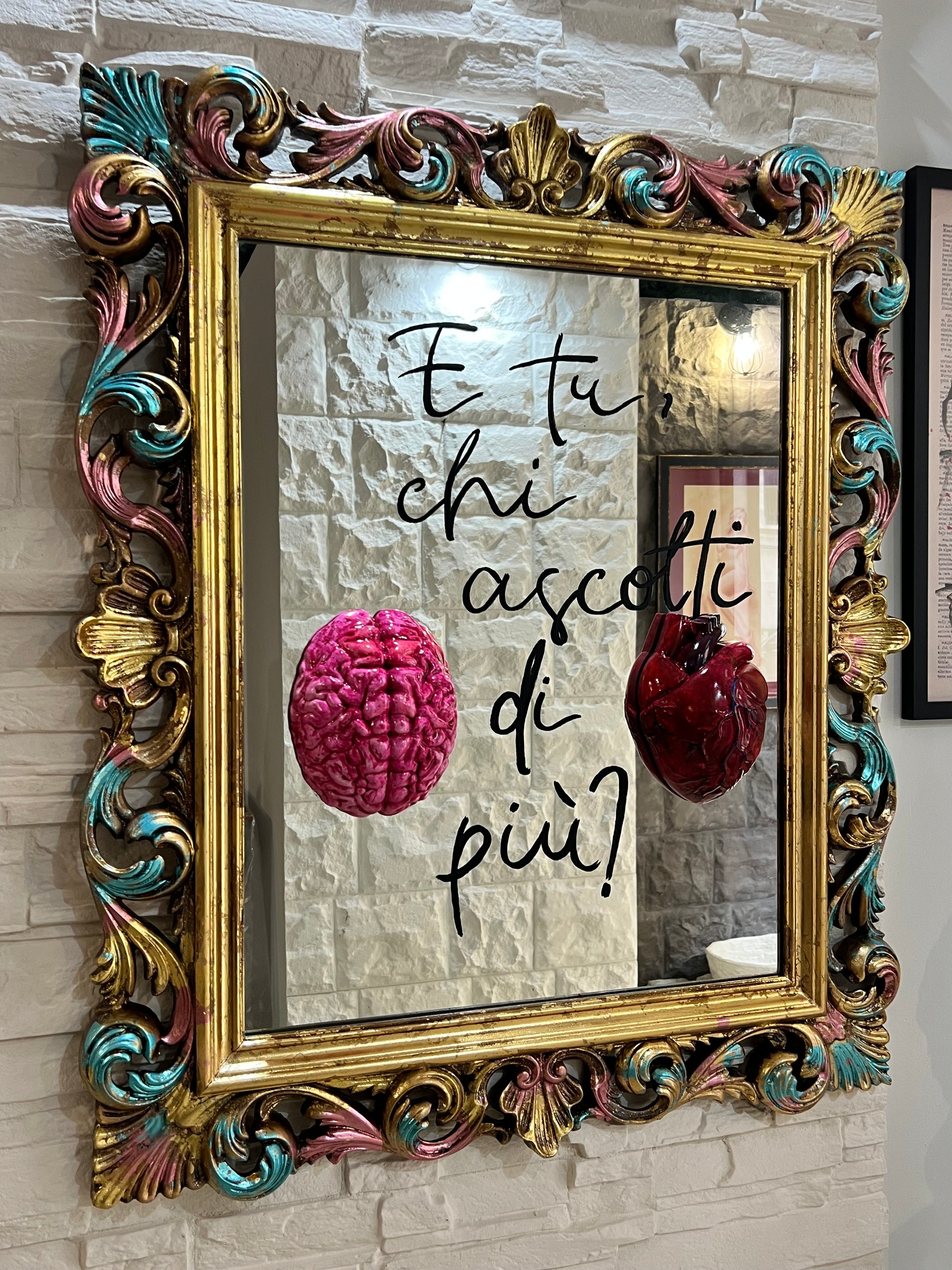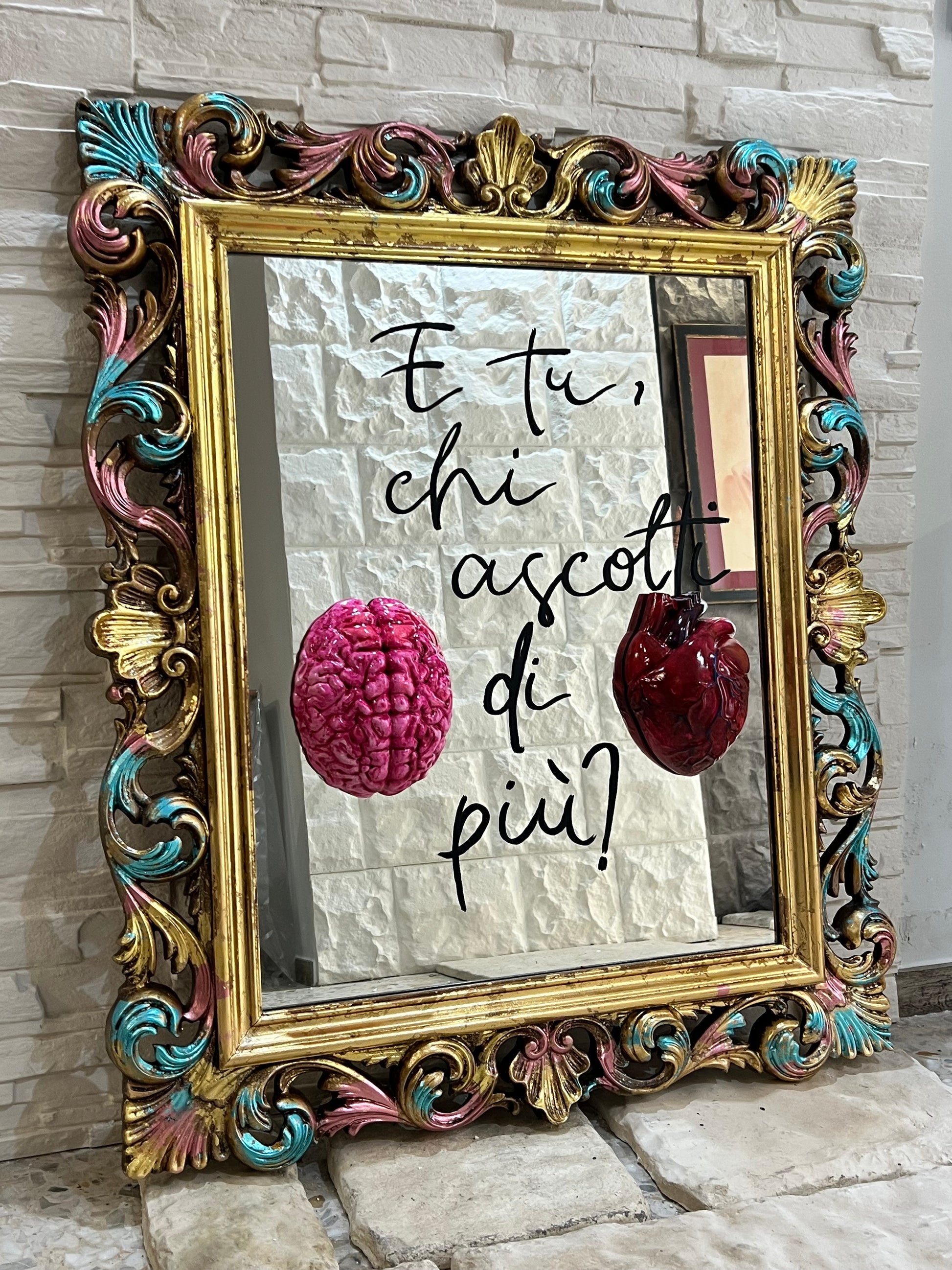 È un autentico specchio di fine ’800, un pezzo di vero antiquariato che ha attraversato il tempo, le persone, le scelte, Oggi rinasce attraverso un intervento artistico contemporaneo: restaurato a mano con foglia oro, foglia rame e foglia turchese, materiali nobili che dialogano con la sua anima antica e ne amplificano il valore.