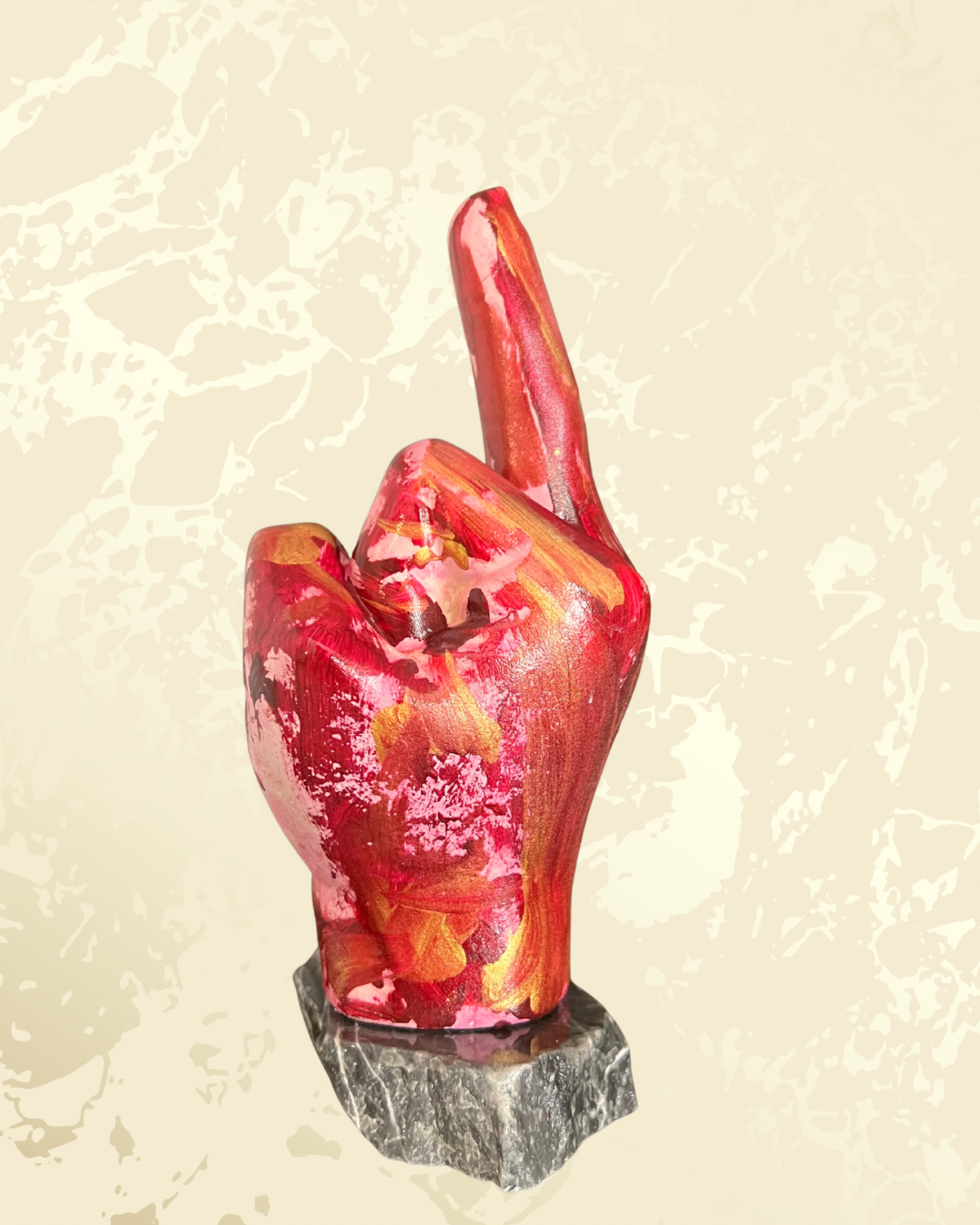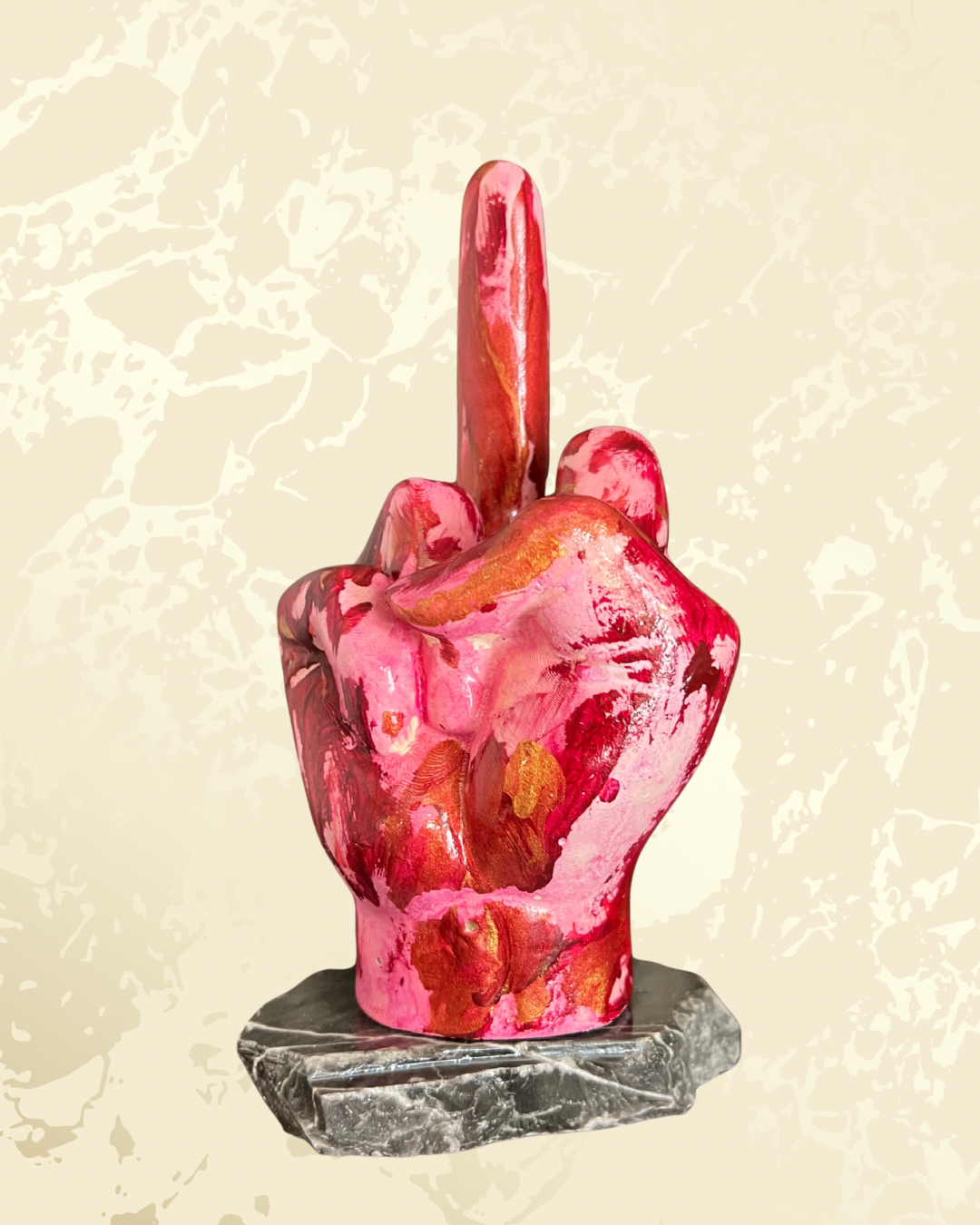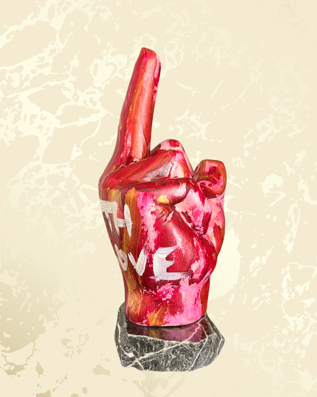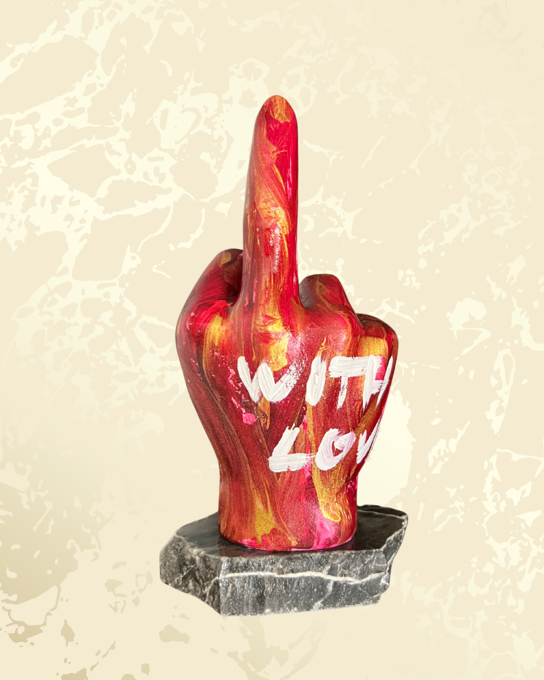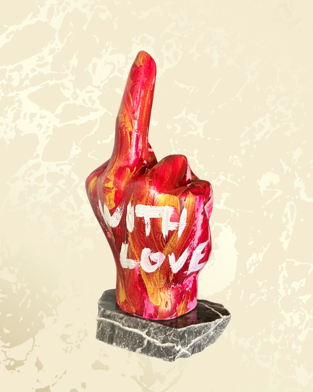 Non è un cuore da rom-com sdolcinata: è un dito medio fiero, spruzzato di rosa fuoco e oro, con “With Love” tatuato sopra come il messaggio più sarcastico dal tuo ex. Perfetto per dire “ti amo… ma va’ al diavolo” con stile pop art