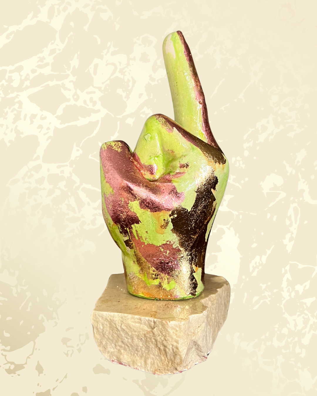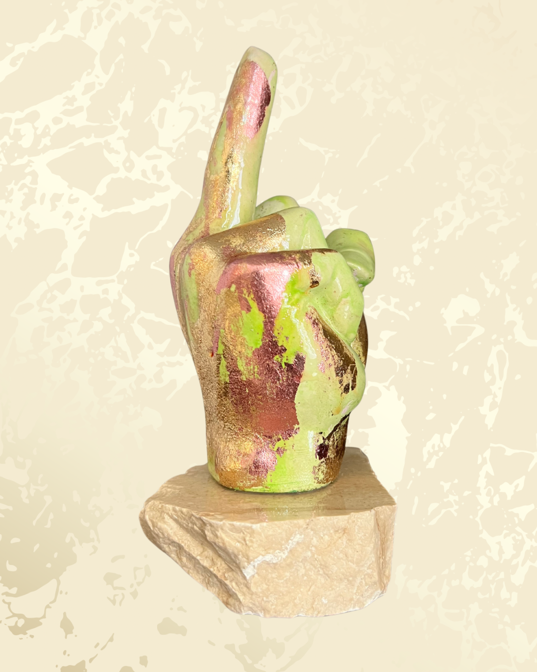 La mano è rivestita in foglia oro e foglia rame, con accenti verdi che spezzano la superficie e ne esaltano l’irregolarità.