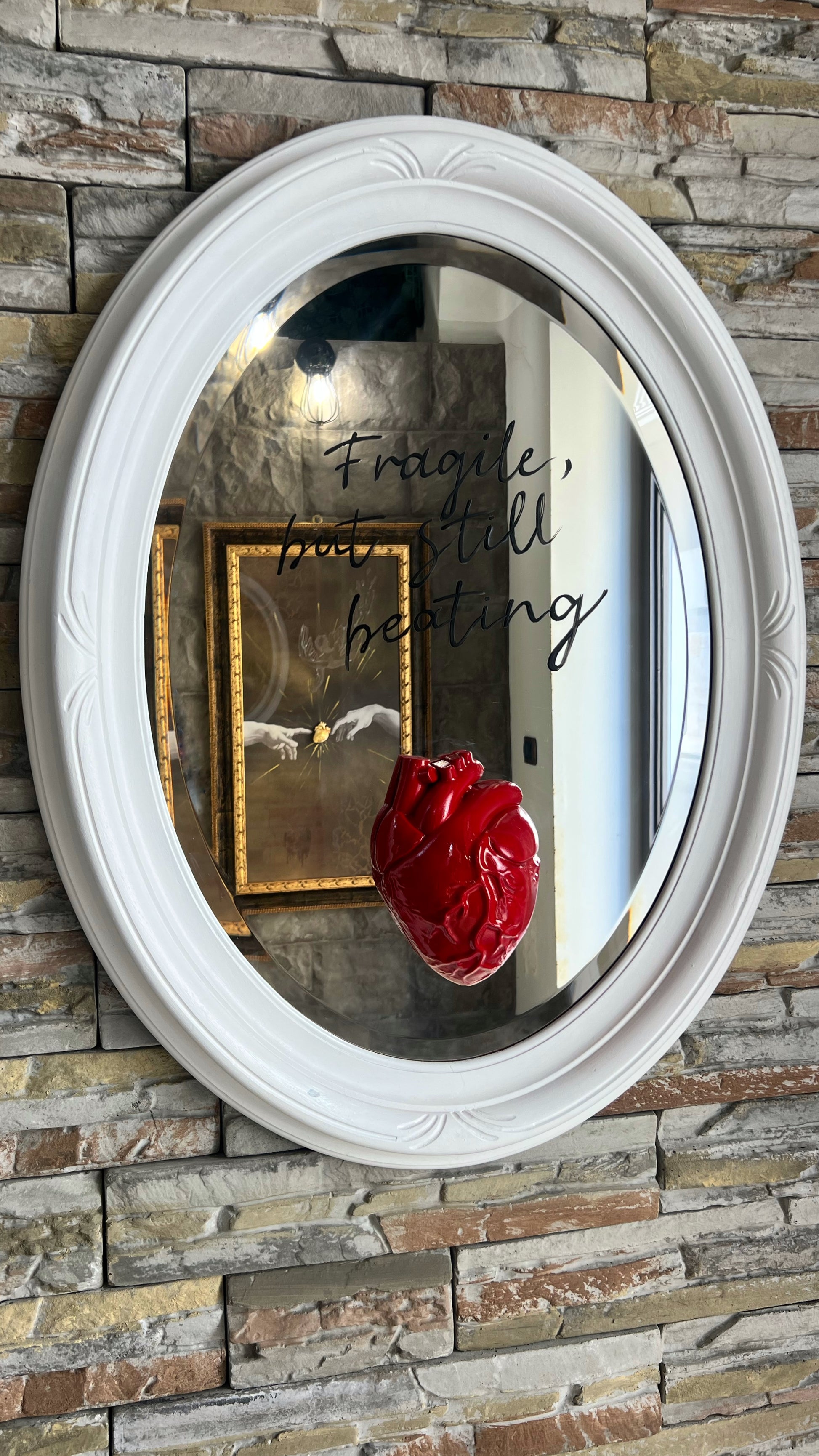 Specchio originale degli anni ’50, restaurato e reinterpretato in chiave contemporanea. La cornice ovale, dal gusto classico e raffinato, abbraccia una superficie specchiante su cui campeggia la frase “Fragile but still beating”, scritta a mano dall’artista Daniela Denota.