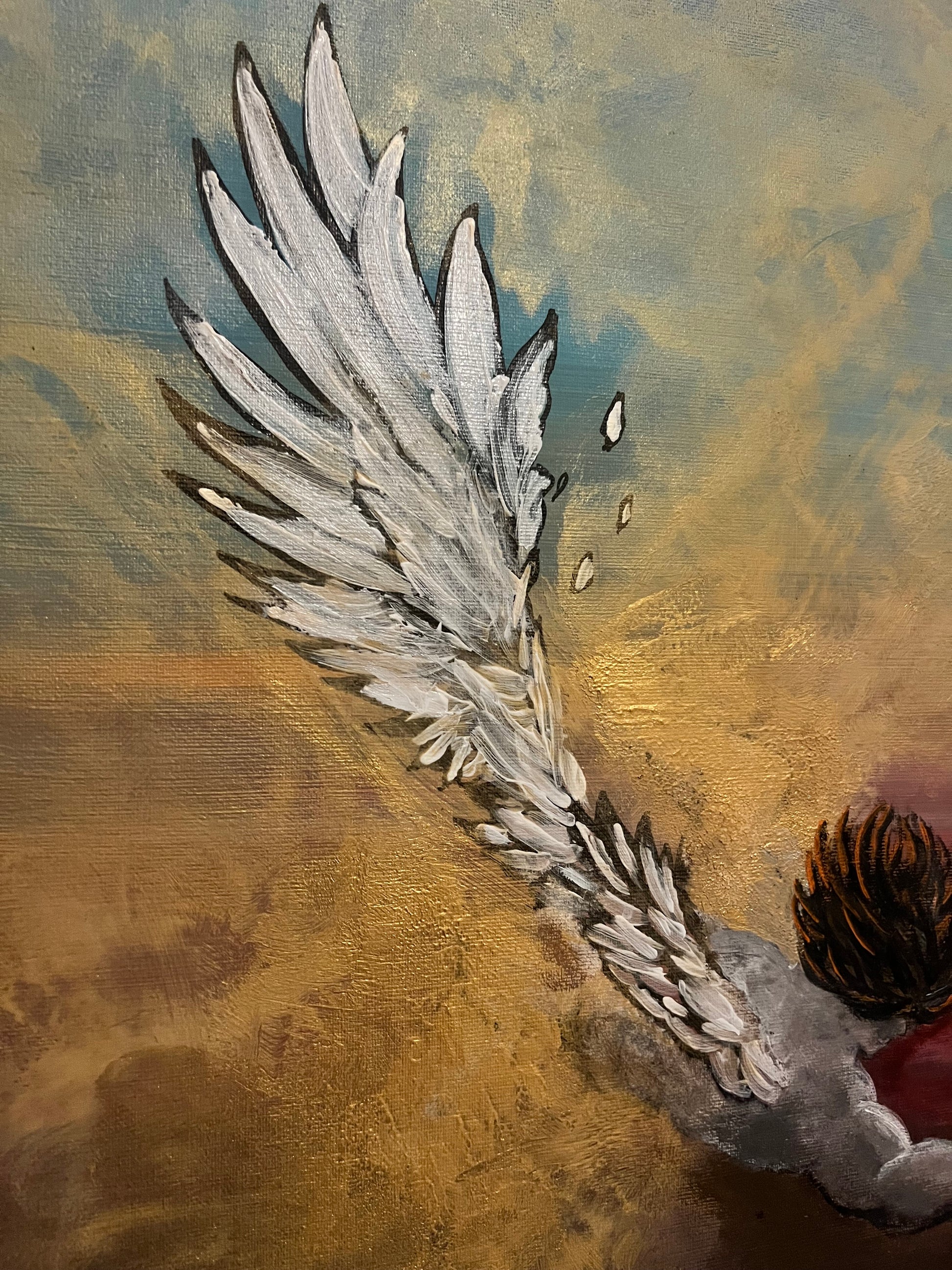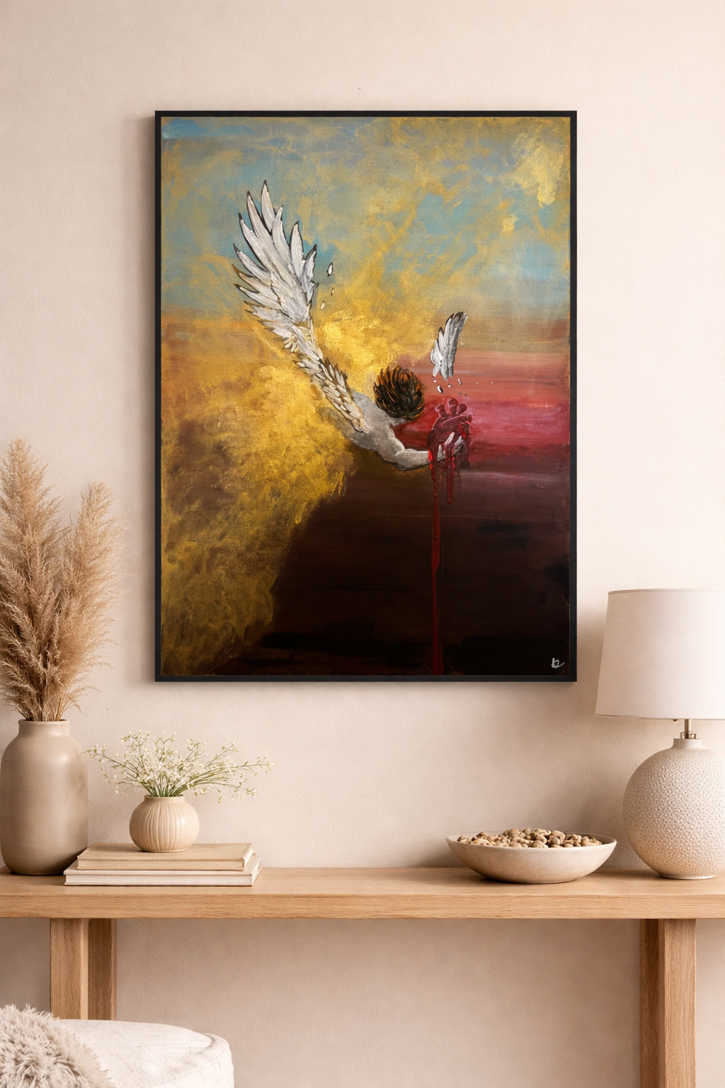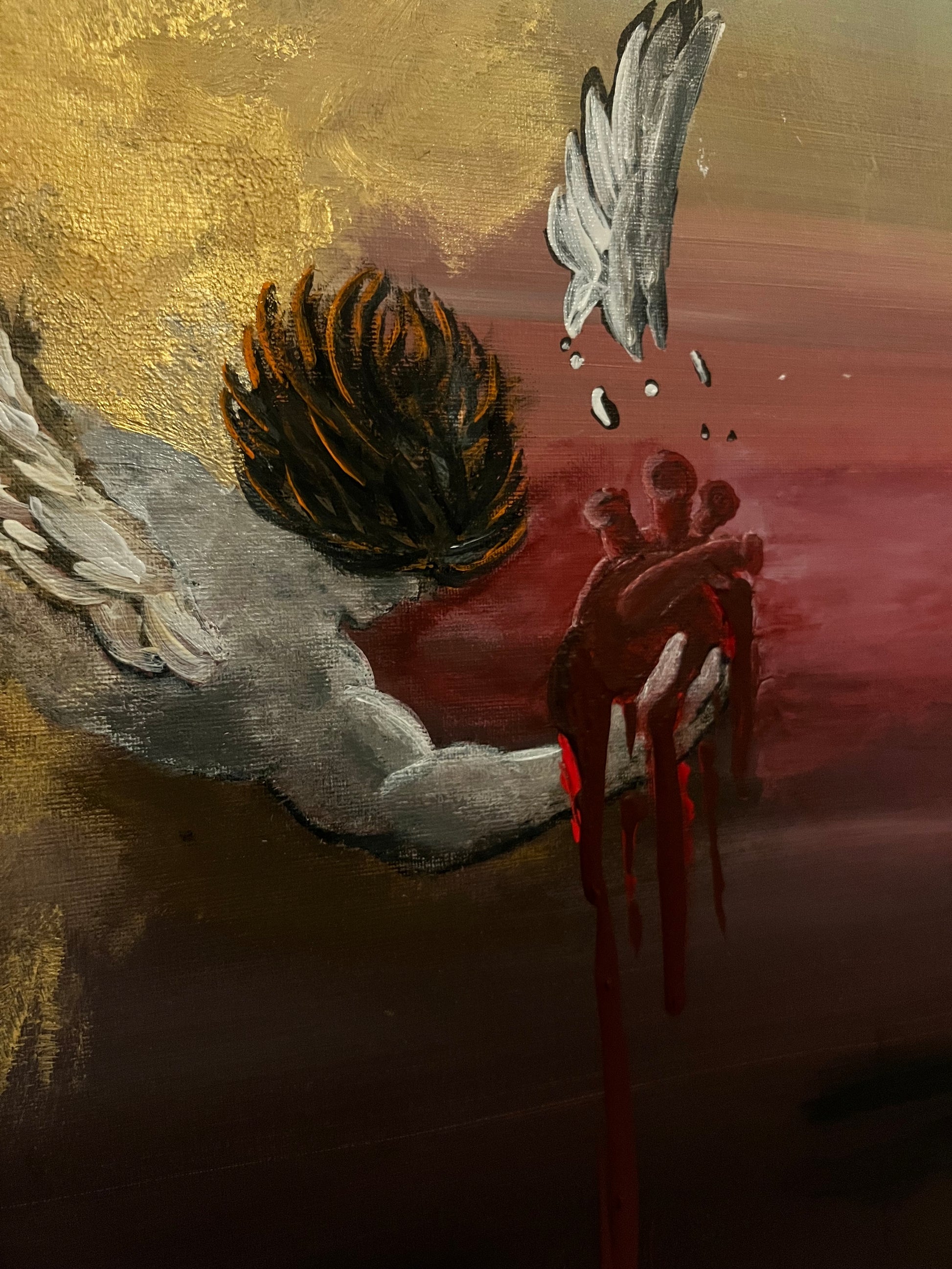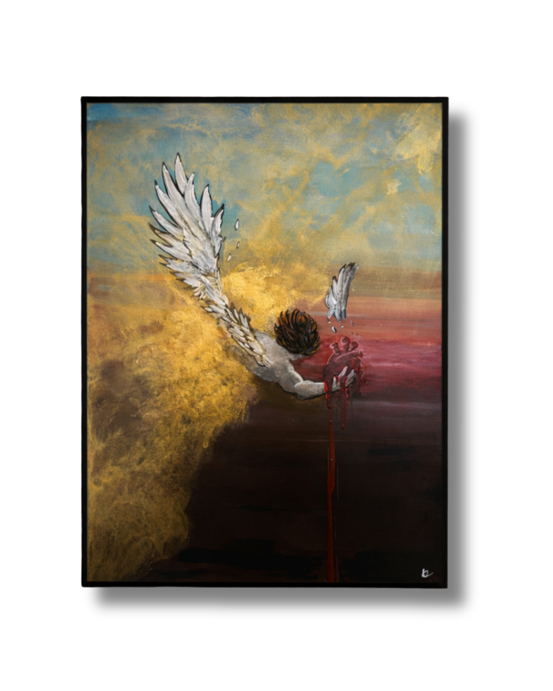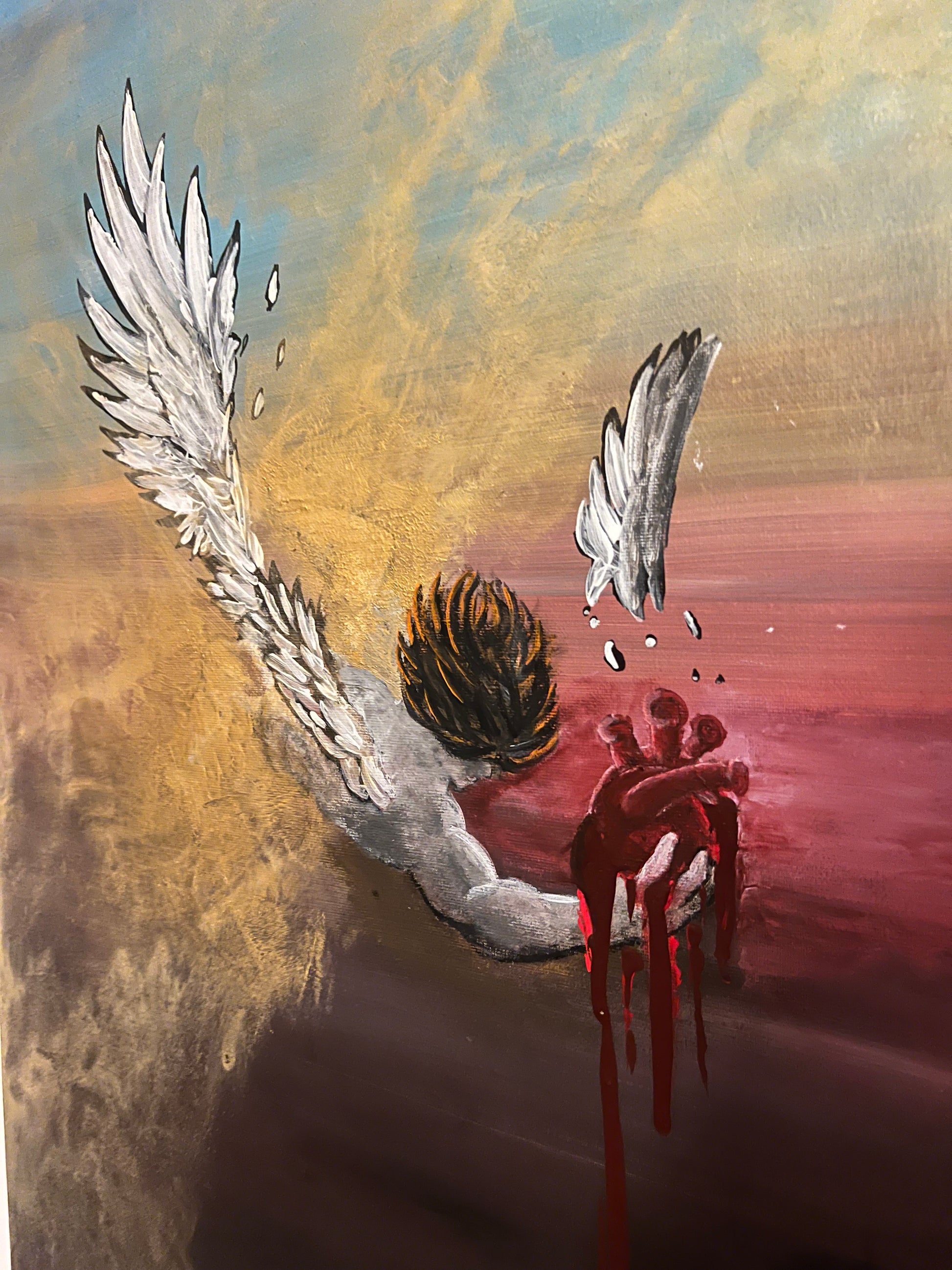 Lucifero, scagliato con violenza dall’empireo celeste, precipita nell’abisso infinito, ma in quel vortice di ombre stringe con disperazione l’unica essenza pura che gli resta: il suo cuore, simbolo di un’innocenza ormai perduta. Le ali, un tempo splendenti, si spezzano contro il vuoto, il sangue cola come lacrime rosse di ribellione, mentre il mondo intorno si dissolve in un caos di luce morente e tenebre eterne. Questo pezzo cattura l’istante eterno della caduta, non solo fisica, ma dell’anima, dove anche il principe della luce lotta per salvare ciò che di sacro gli rimane.