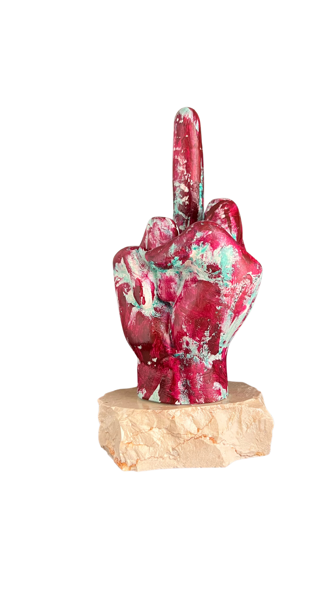 Un gesto diretto, una verità senza filtri. Scultura dipinta a mano, tra rosso e turchese, con la scritta “I LOVE YOU” che ribalta il significato del middle finger. Un pezzo provocatorio, ironico e autentico, montato su base in pietra naturale.