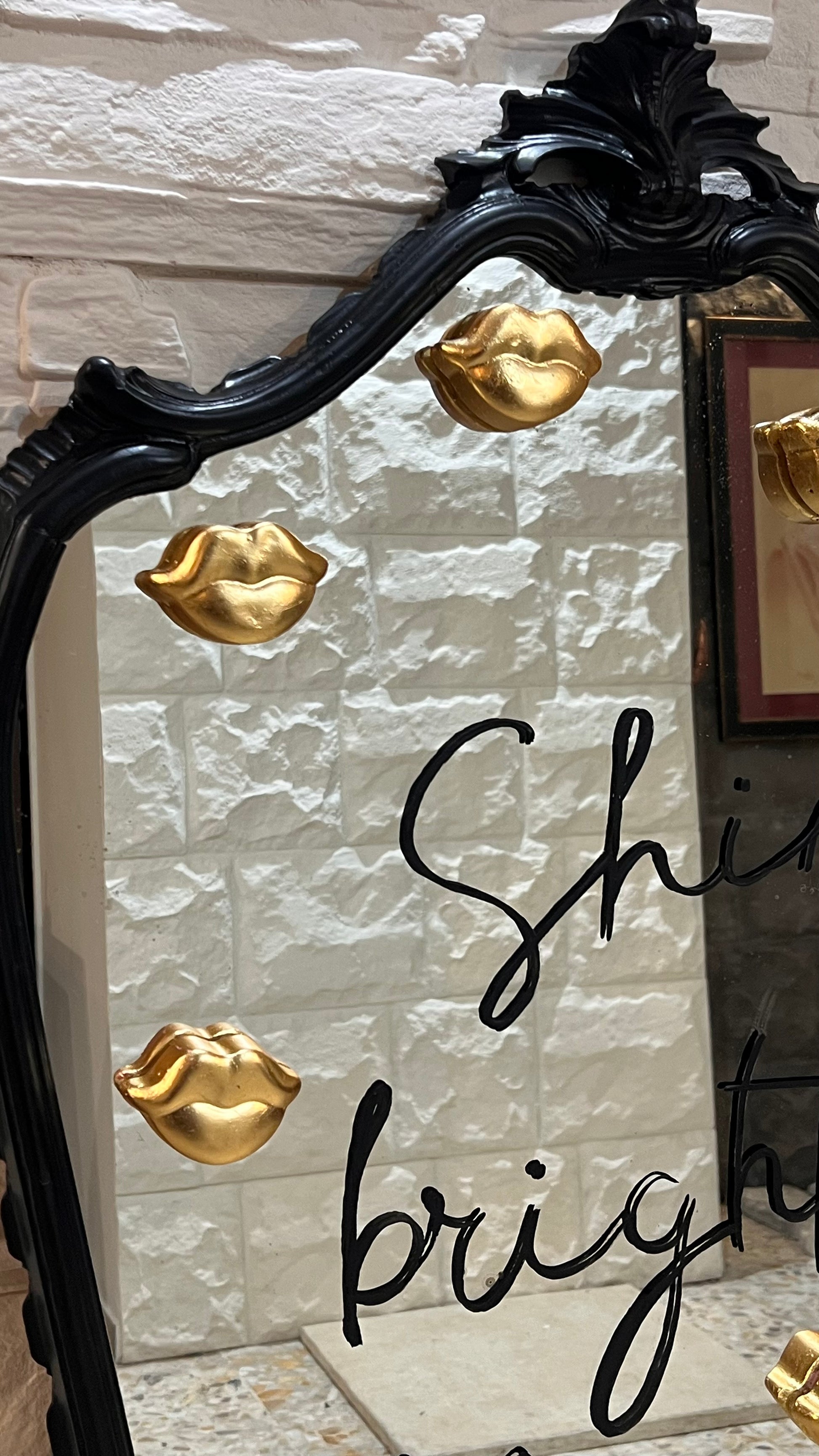 Specchio d’epoca restaurato, rifinito in nero opaco.Dettagli in rilievo realizzati a mano e rivestiti in foglia oro.Un’opera che unisce passato e contemporaneo, materia e luce, riflessione ed emozione